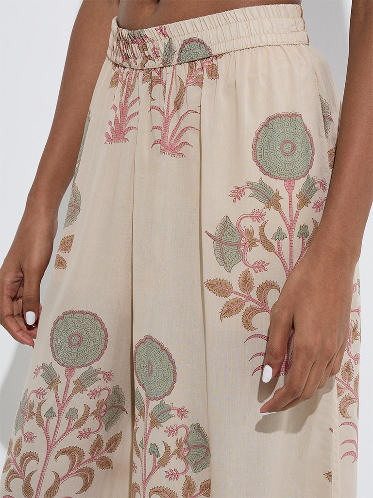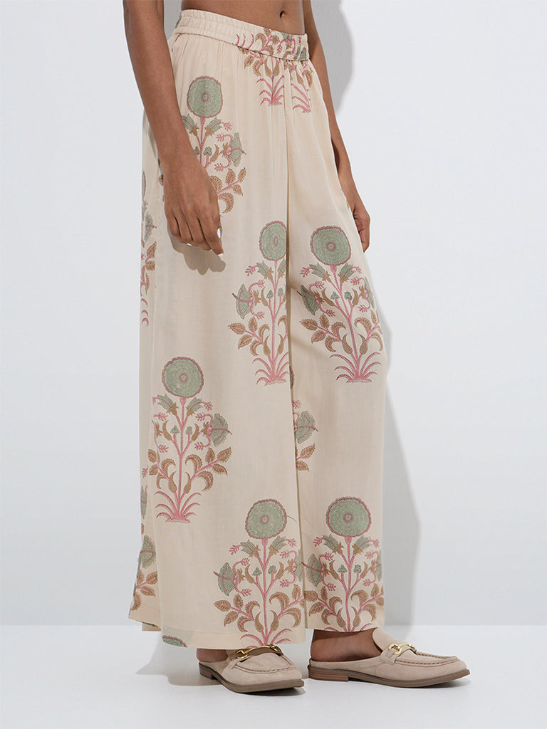 Embrace a blend of comfort and style with these off-white palazzos from Zuba. Designed with a vibrant floral print. they’re crafted from quality fabric and feature a high-rise fit with a smooth elastic waistband and adjustable drawstrings for a customizable and flattering fit.
