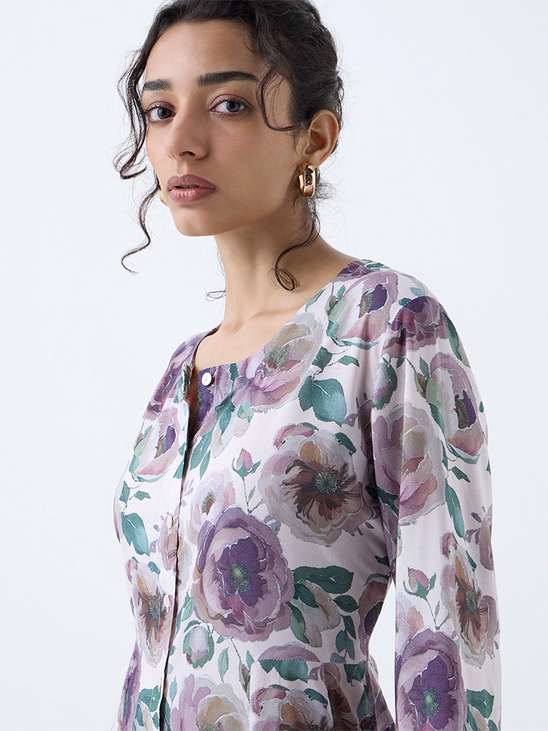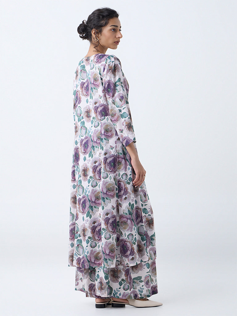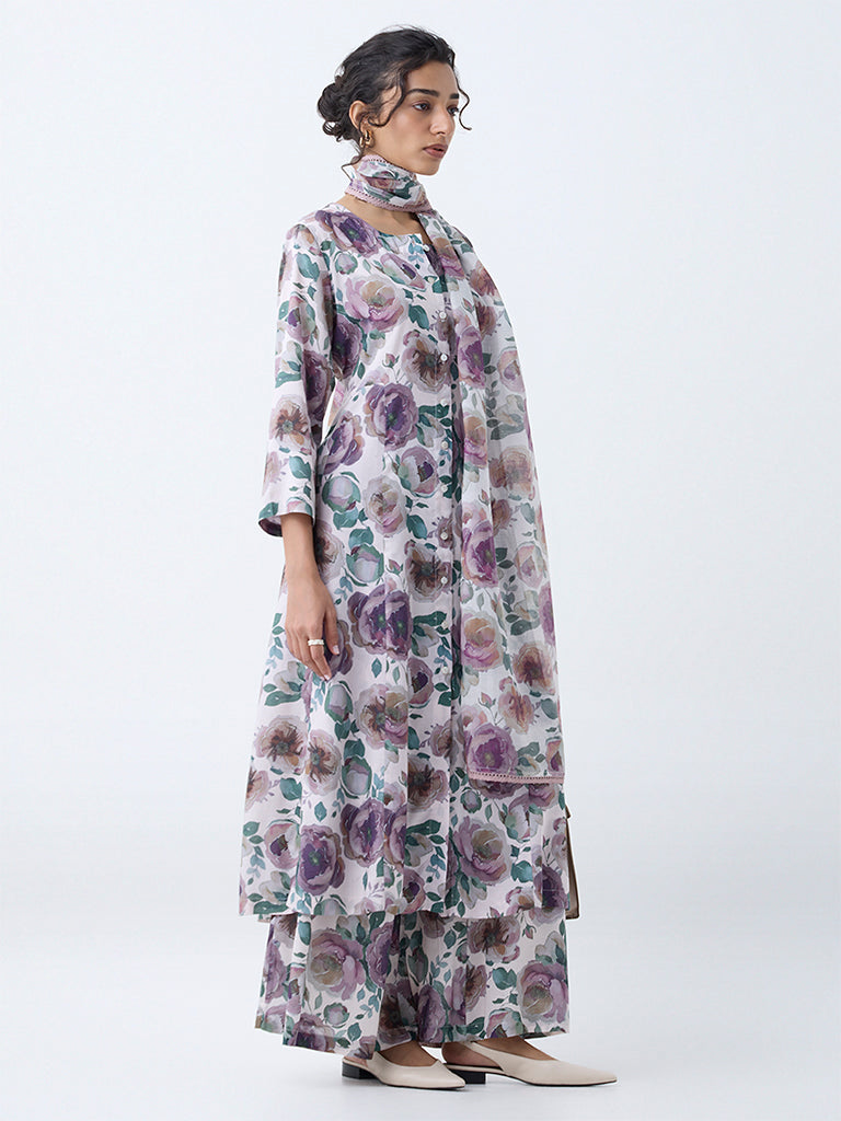Zuba reimagines festive staples with this off-white A-line kurta. adorned in bold floral motifs for a touch of artistry. The lightweight fabric ensures all-day comfort. while the round neck. buttoned placket. and three-fourth sleeves create a timeless profile. Designed for both celebration and ease. it’s a wardrobe essential with a contemporary twist.