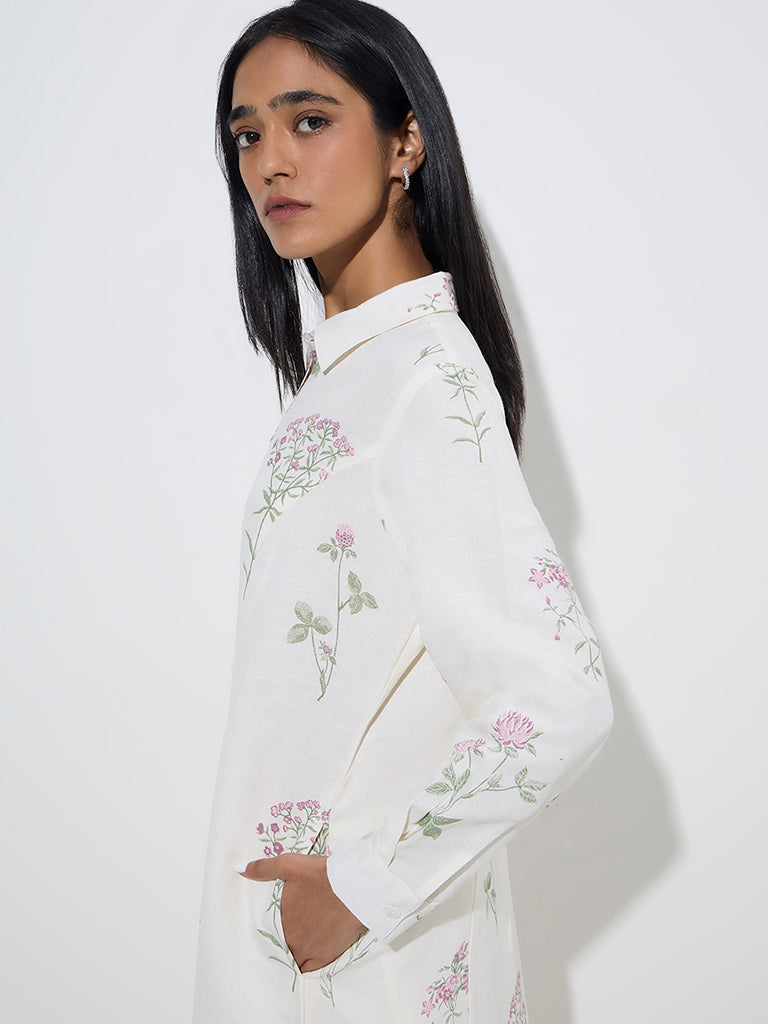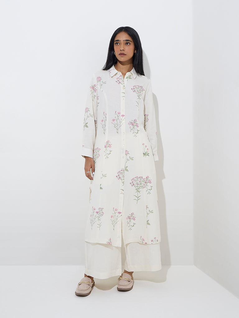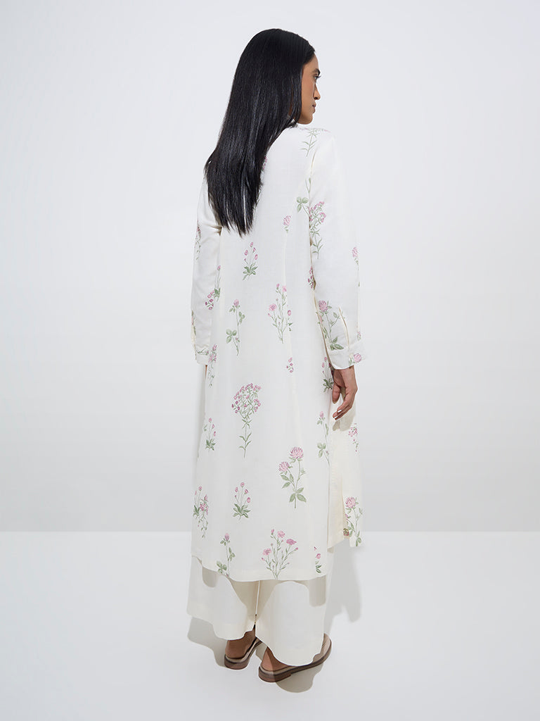 This off-white kurta by Zuba is designed with appealing floral prints. Offering an A-line frame. the rich-linen blend fabric garment includes a spread collar. button down front. full sleeves and side pockets.