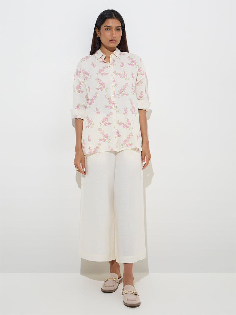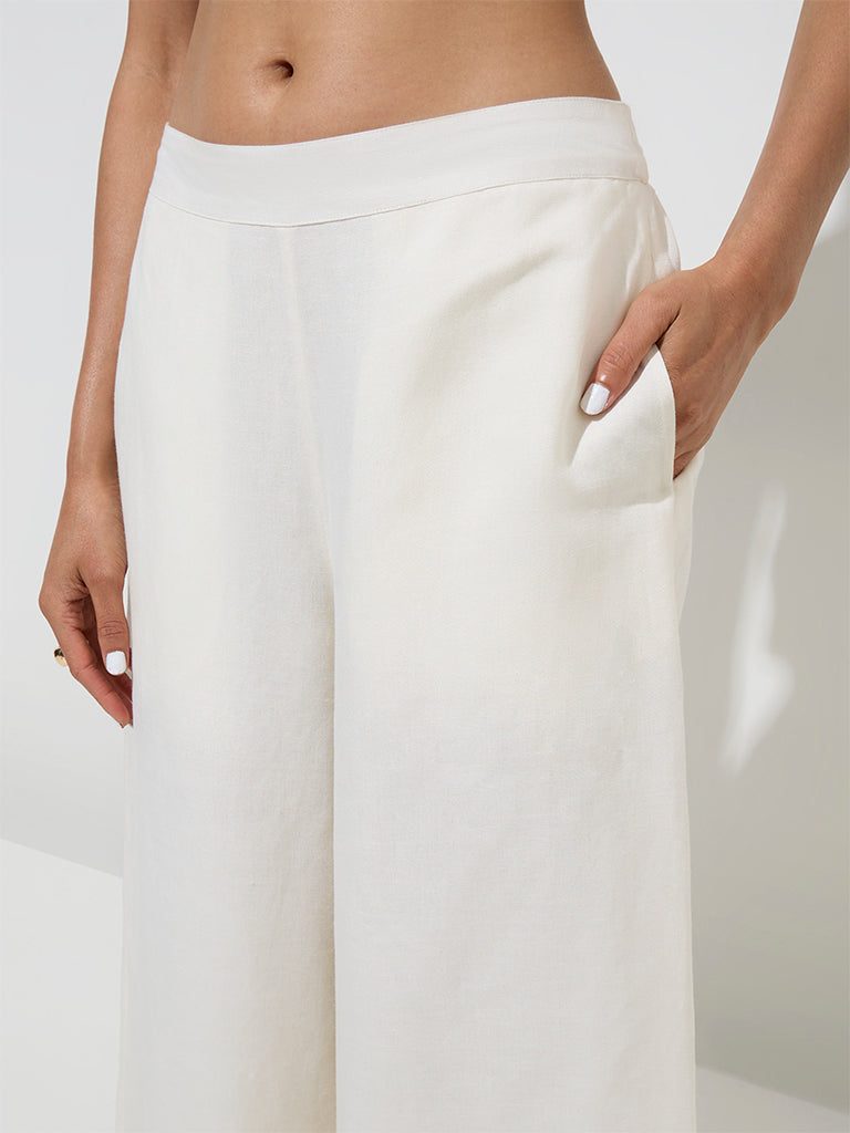 These off-white palazzos from Zuba are tailored from a linen-blend fabric for a refined yet breathable feel. Designed in a mid-rise profile. they feature an elasticised waist for a comfortable fit. while functional side pockets add a practical touch.