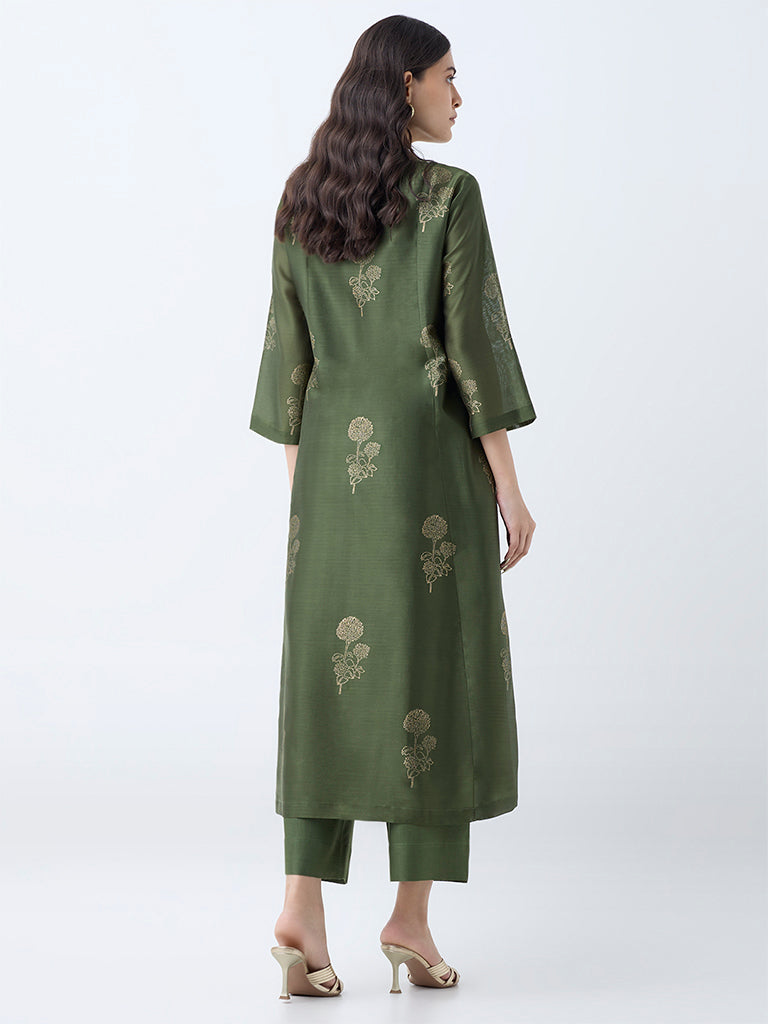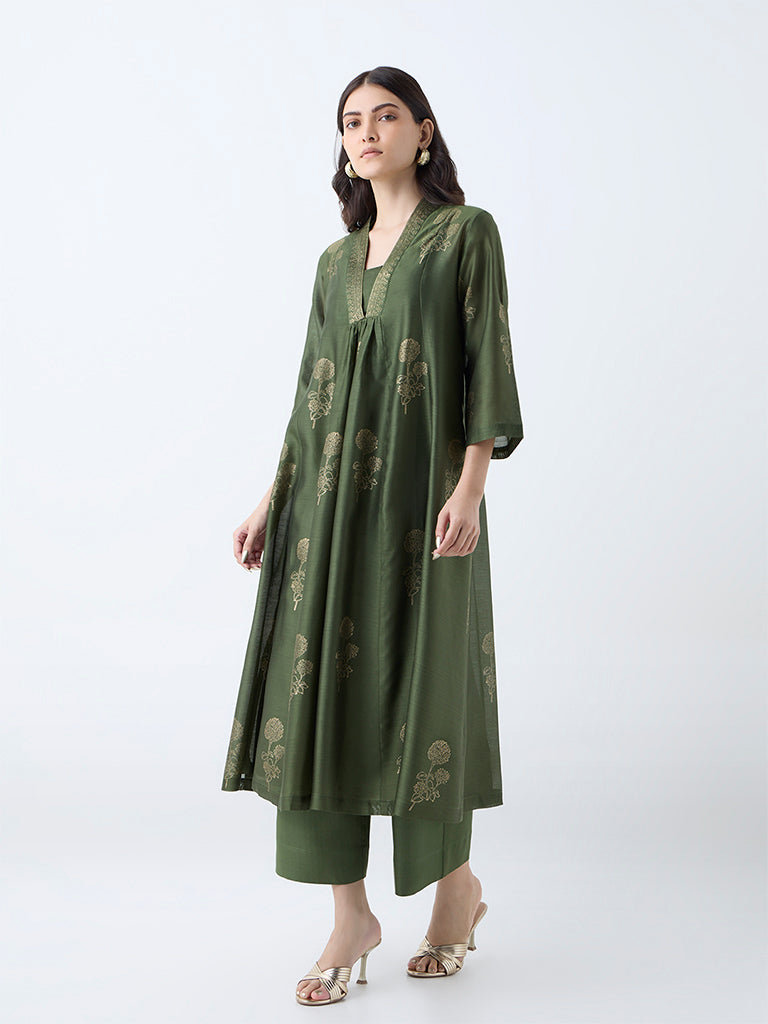 Elevate your occasion wear repertoire with this olive Anarkali kurta from Zuba. crafted in a soft cotton-blend fabric for fluid drape and comfort. Designed with a flattering V-neck and three-quarter sleeves. it is detailed with a gold-toned floral print that brings understated festive charm. The ensemble is finished with a matching inner. offering both ease of wear and a secure fit.