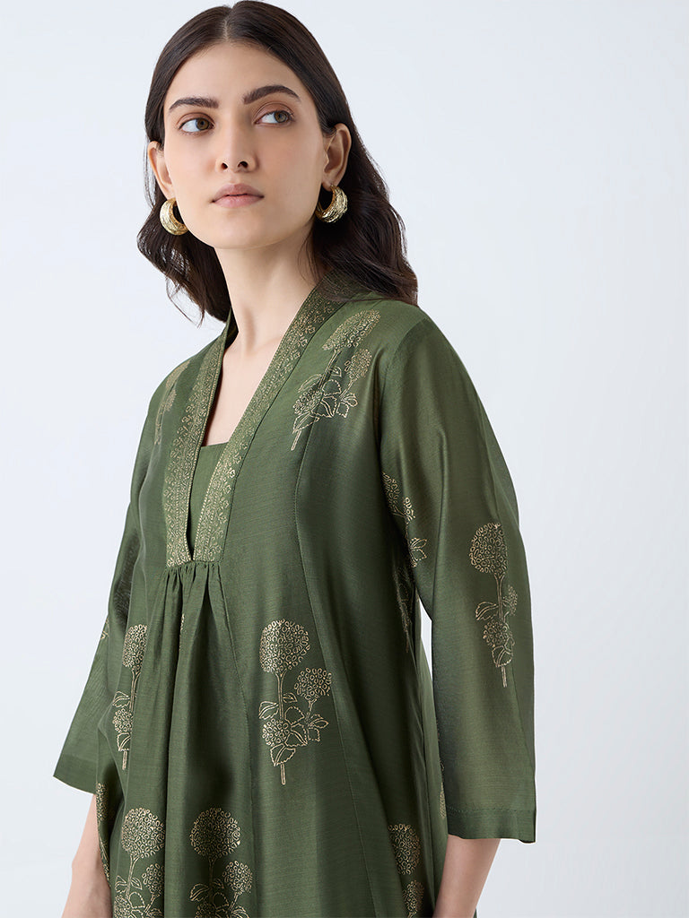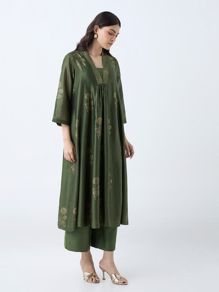 Zuba Olive Floral Cotton-Blned Anarkali Kurta with Inner