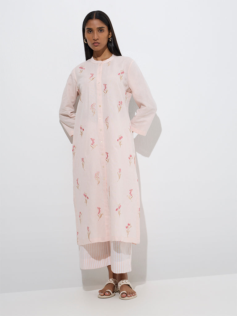 Zuba Pink Embroidered Cotton-Blend A-Line Kurta
