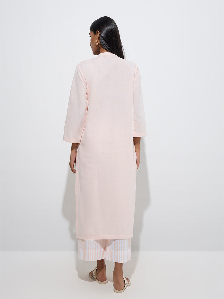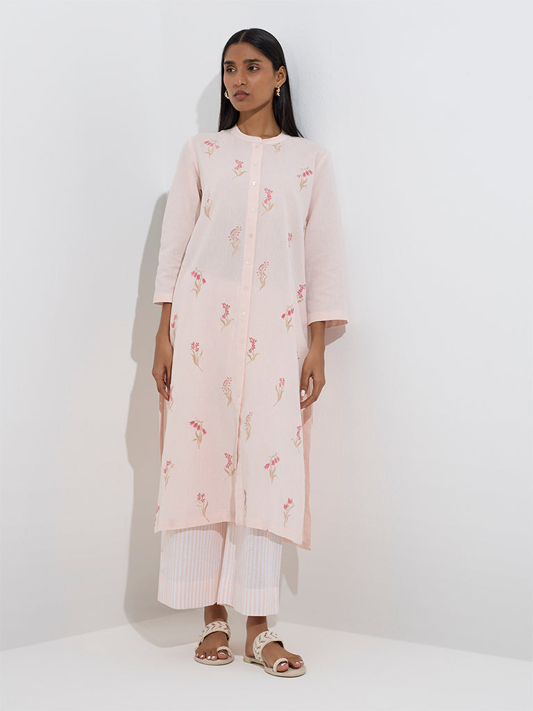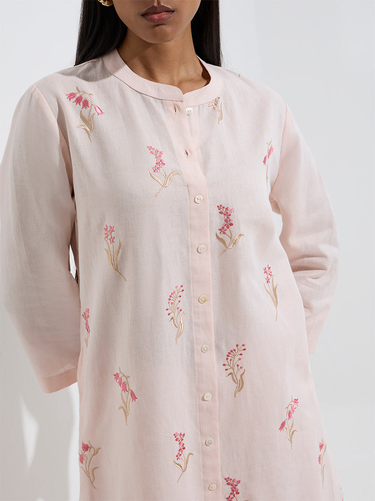 This pink kurta from Zuba is woven from a rich cotton-linen blend for a luxurious feel. Styled in an elegant A-line silhouette. it showcases exquisite floral embroidery along with a mandarin collar. a button placket and three-quarter sleeves. A discreet side pocket adds a thoughtful touch of practicality to this graceful piece.
