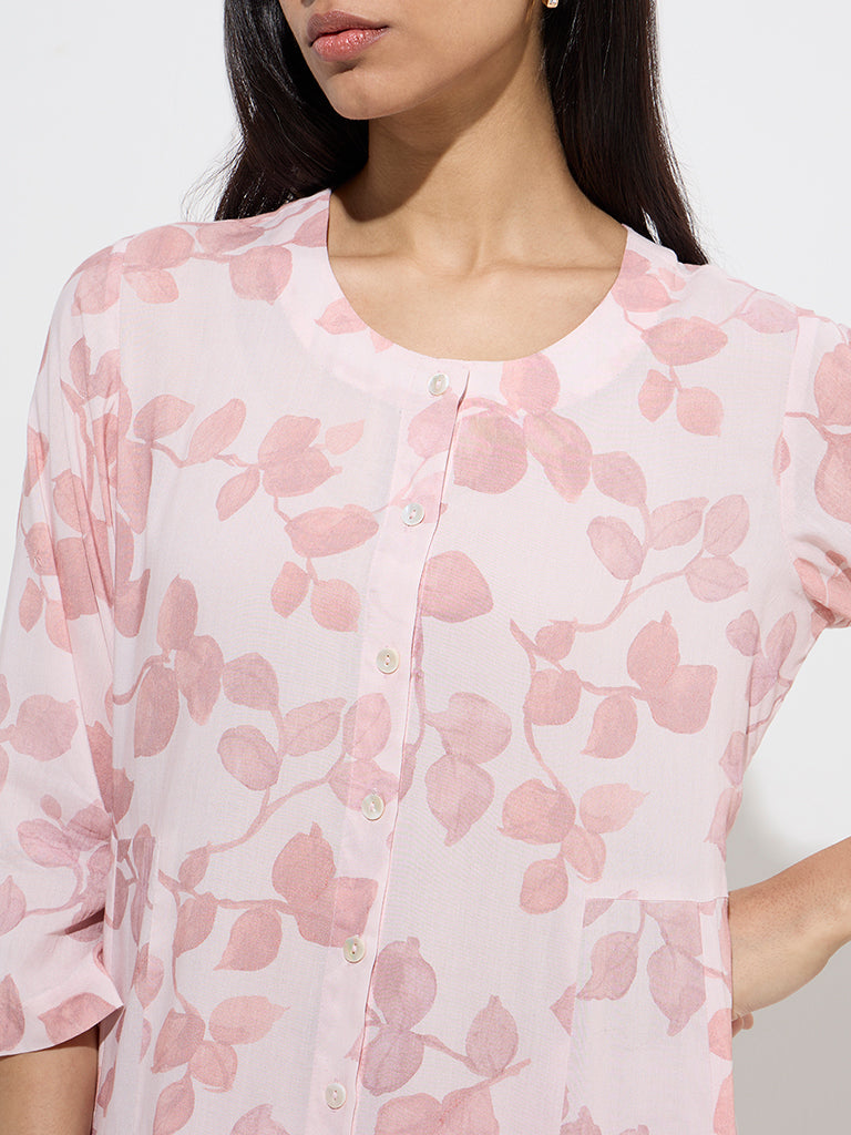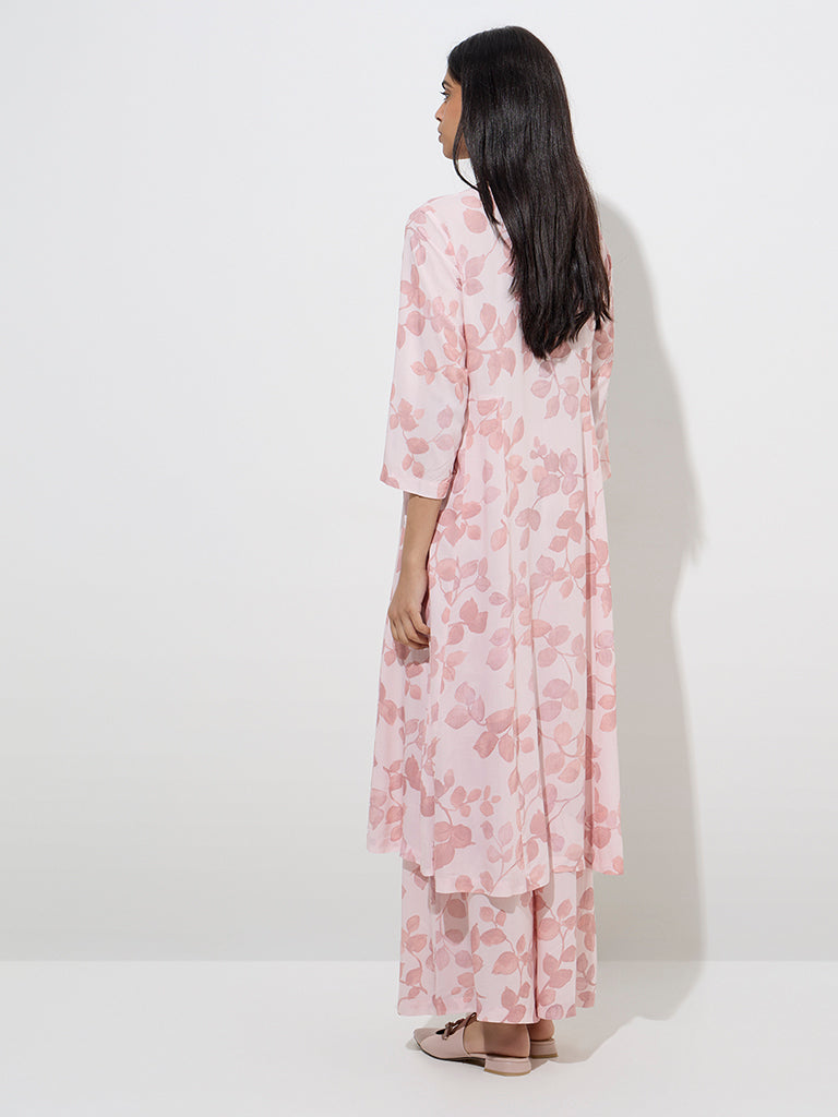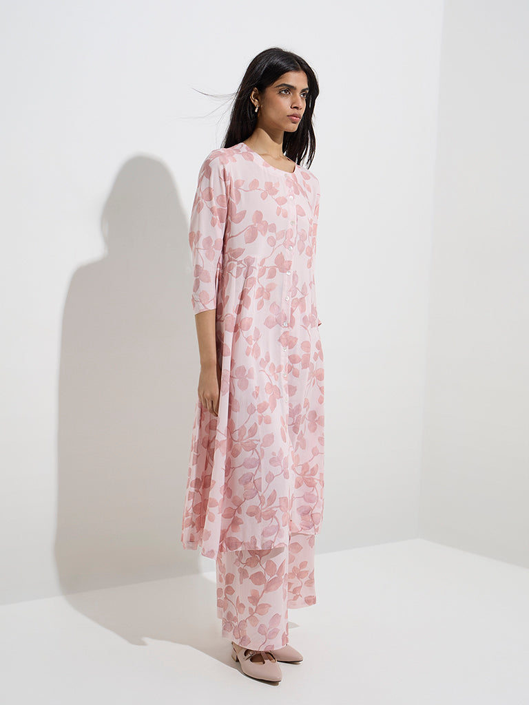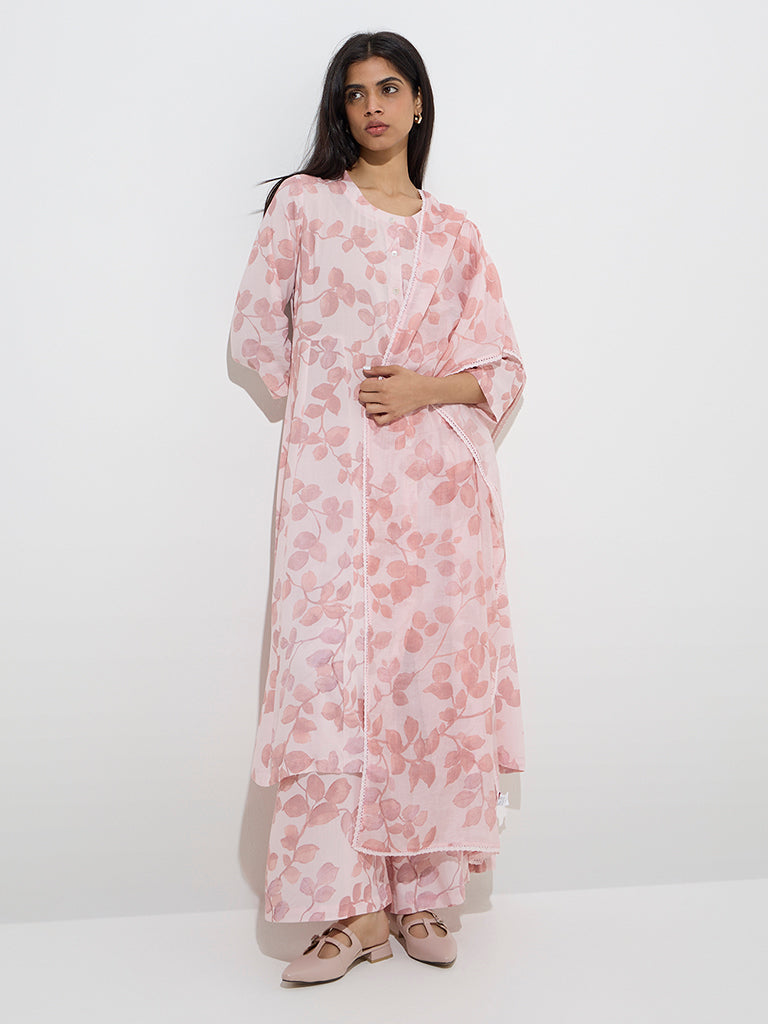 Sculpted in an A-line silhouette. this pink kurta from Zuba highlights delicate leaf prints for a timeless appeal. Designed with a round neck. a button-up front. and three-quarter sleeves. it is crafted from a breathable fabric for a comfortable feel against the skin.