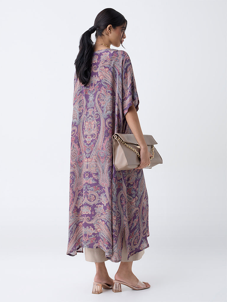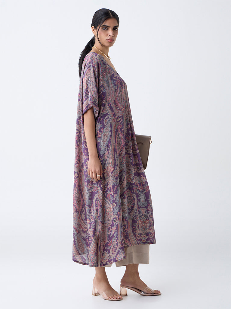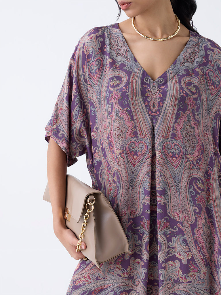 Zuba presents this purple A-line kaftan. adorned with a traditional-inspired print that brings a vibrant. elegant touch to your wardrobe. Crafted from breezy. lightweight fabric. it features a V-neck and flowing batwing sleeves. offering effortless comfort and a graceful silhouette ideal for relaxed. stylish occasions.