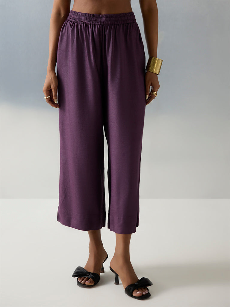 Ease meets elegance in these purple ethnic pants from Zuba. The solid hue makes them a versatile foundation for both printed and tonal kurtas. while the smooth elastic waistband ensures day-long comfort. A simple essential. reimagined for effortless dressing.
