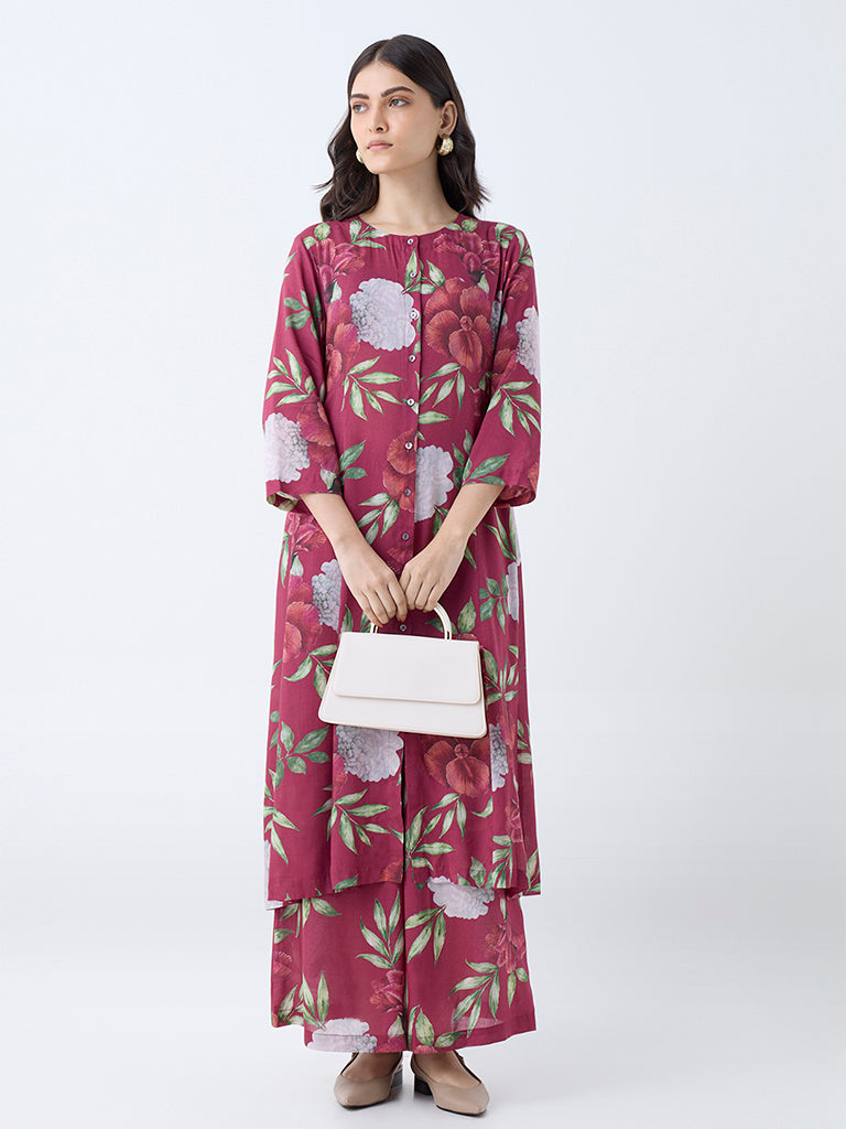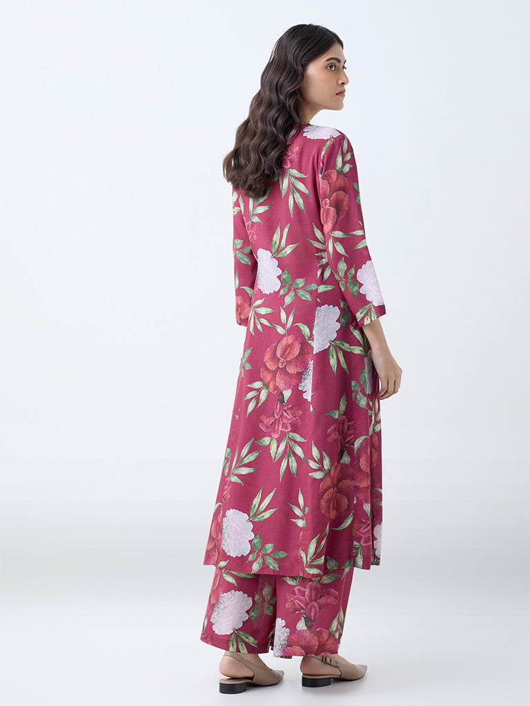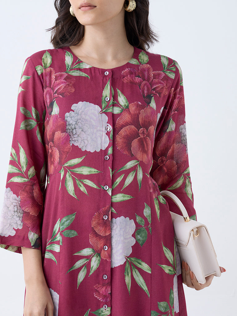 Revamp your ethnic assortment with this red kurta from Zuba. fashioned with graceful floral motifs for timeless appeal. Made from quality fabric in a graceful A-line silhouette. it drapes beautifully while ensuring day-long comfort. The round neck and button placket introduce a refined finish. while three-quarter sleeves enhance the elegance of the design.