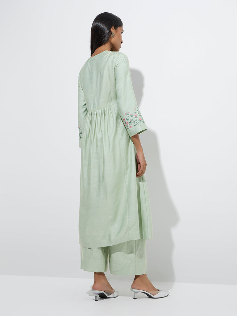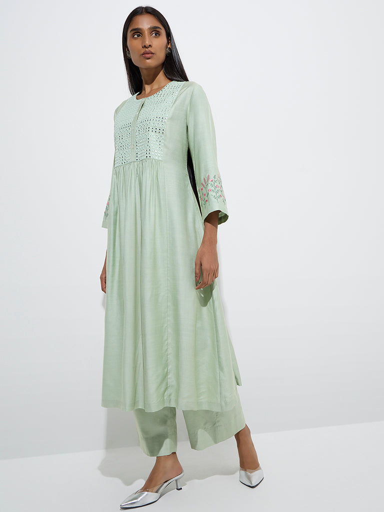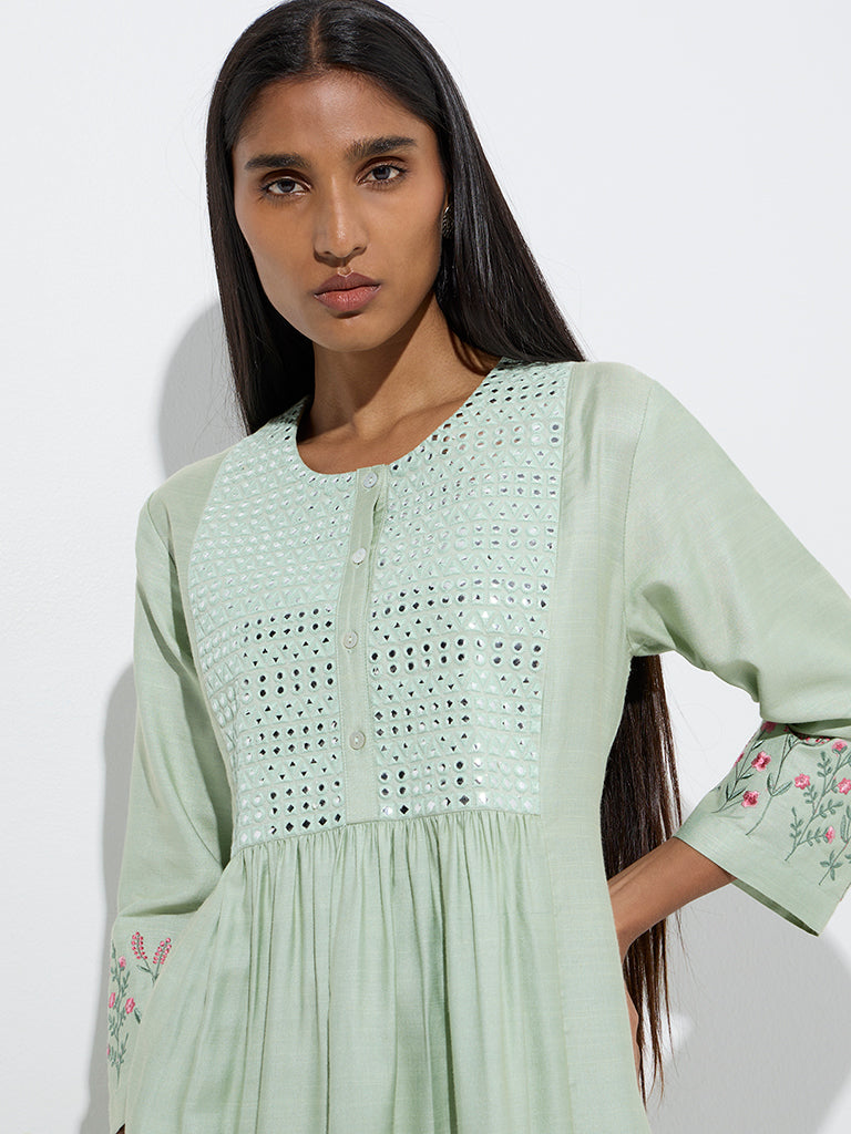 This sage kurta from Zuba features intricate mirror embroidery at the yoke for a regal look. Crafted from a premium cotton-silk blend in an A-line silhouette. it showcases a round neck and three-quarter sleeves. adorned with delicate floral embroidery for a graceful finish.