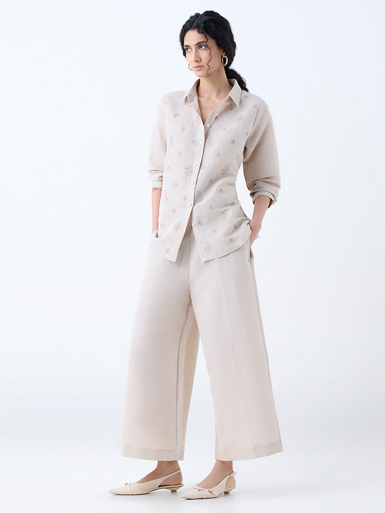 Zuba Taupe Floral Embroidered Linen-Blend Ethnic Tunic