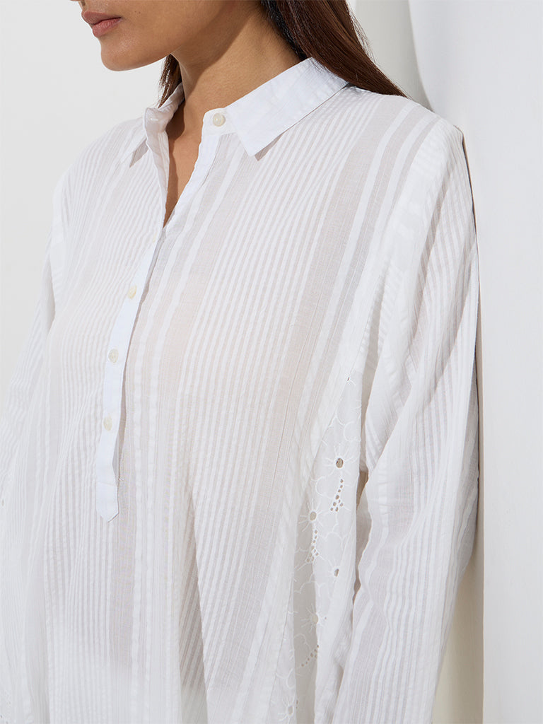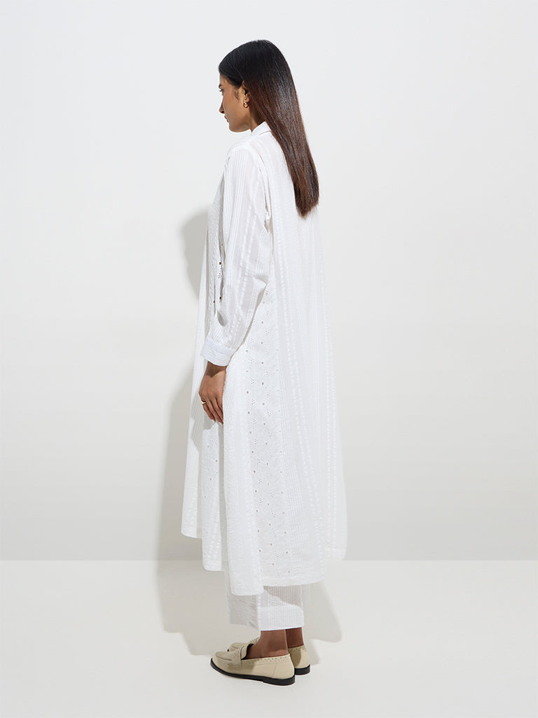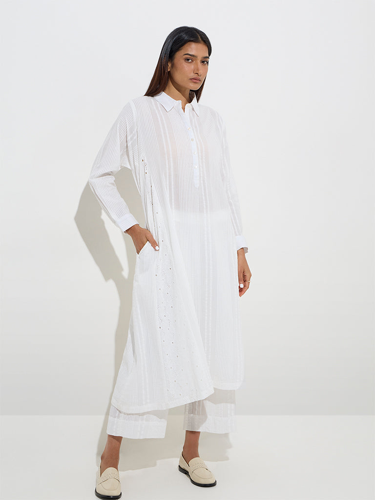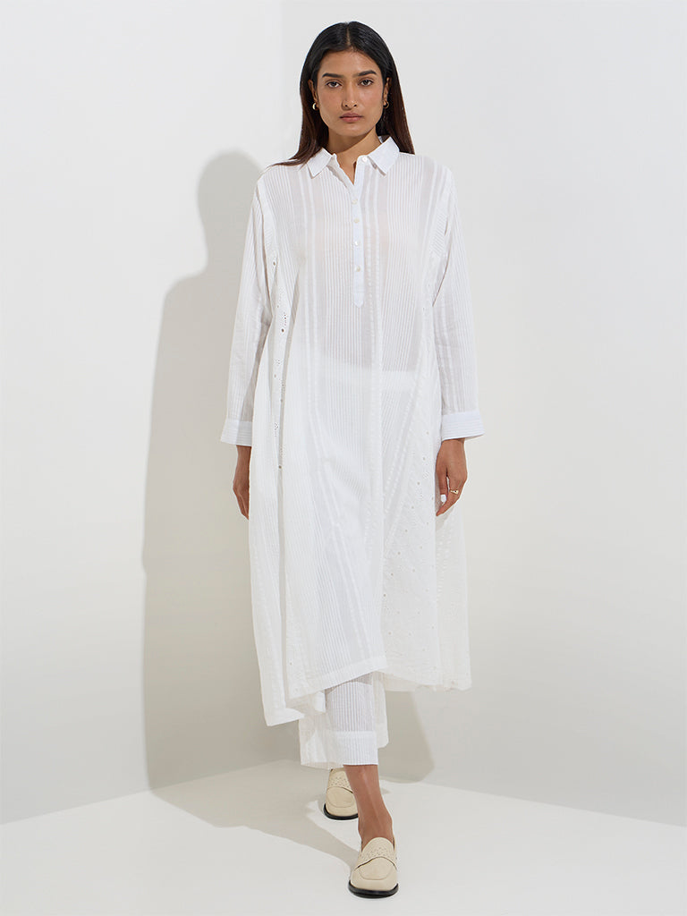 Zuba White Seersucker Striped Cotton A-Line Kurta