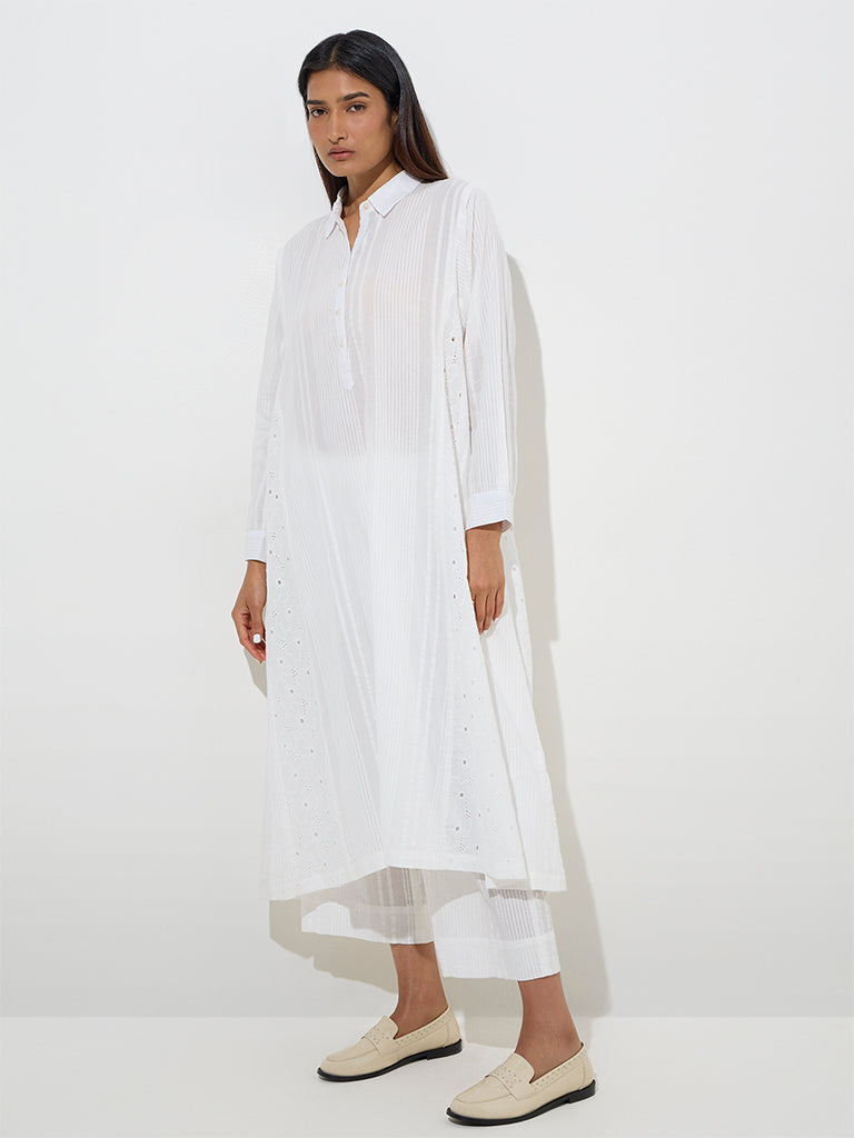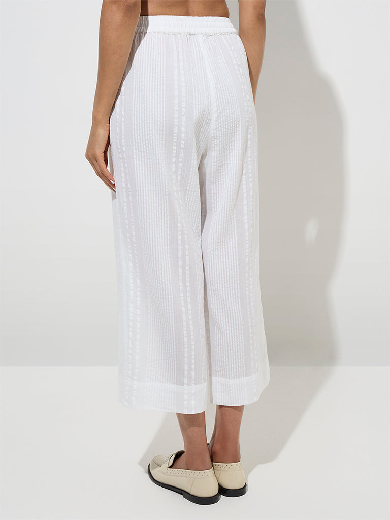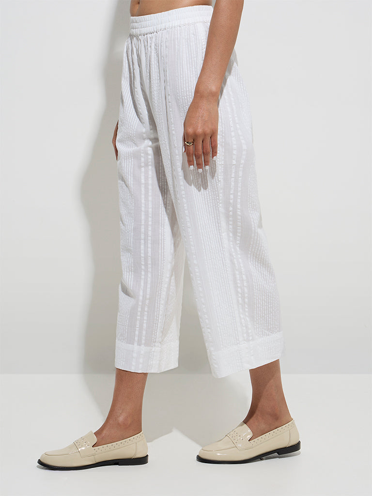 Zuba White Seersucker Striped Cotton Ethnic Pants