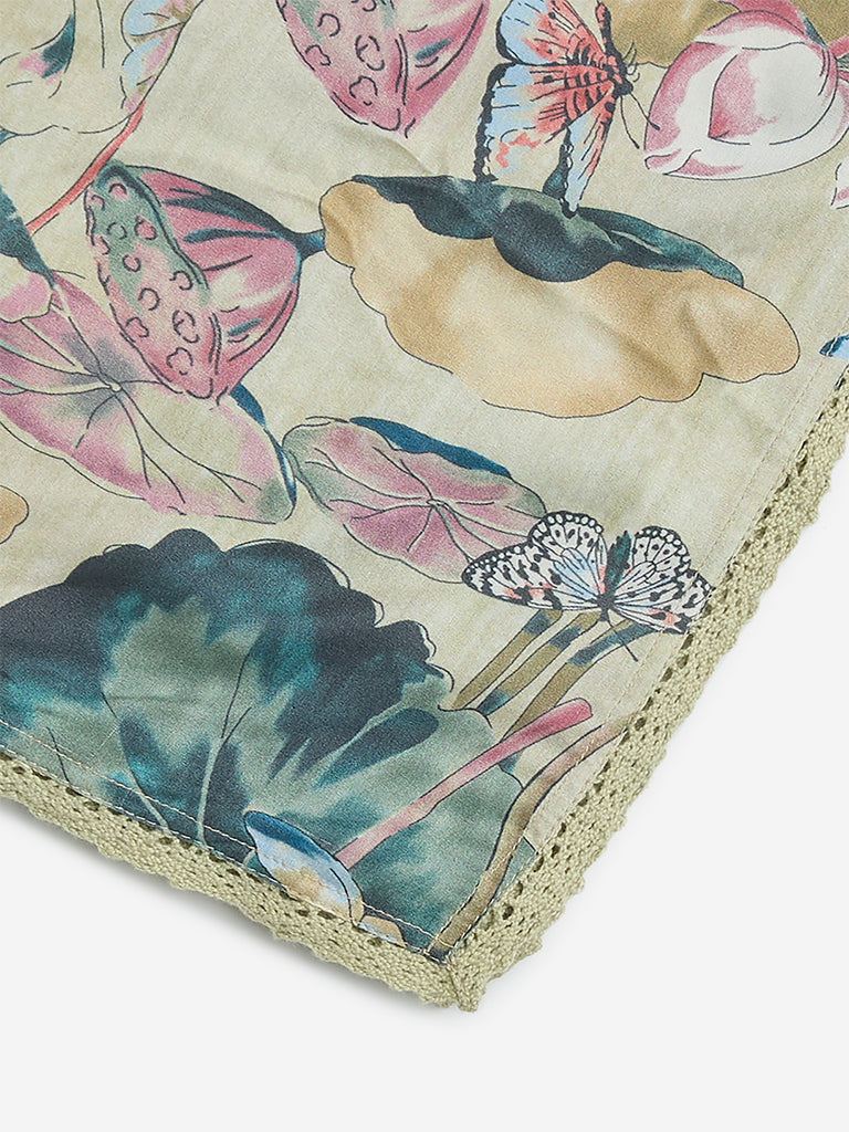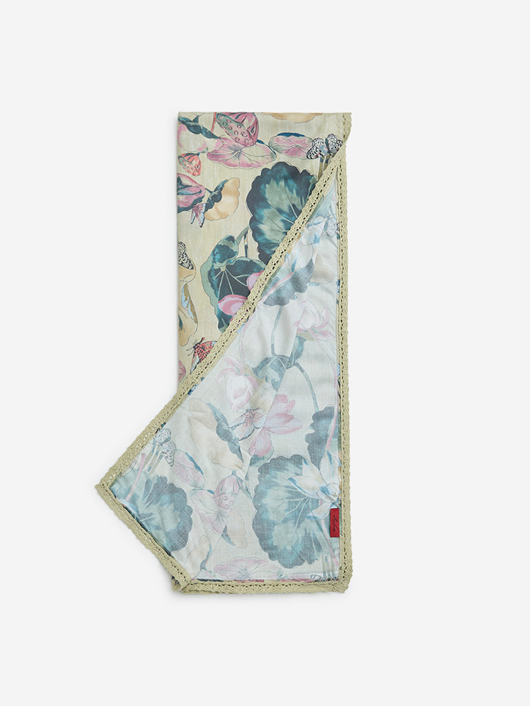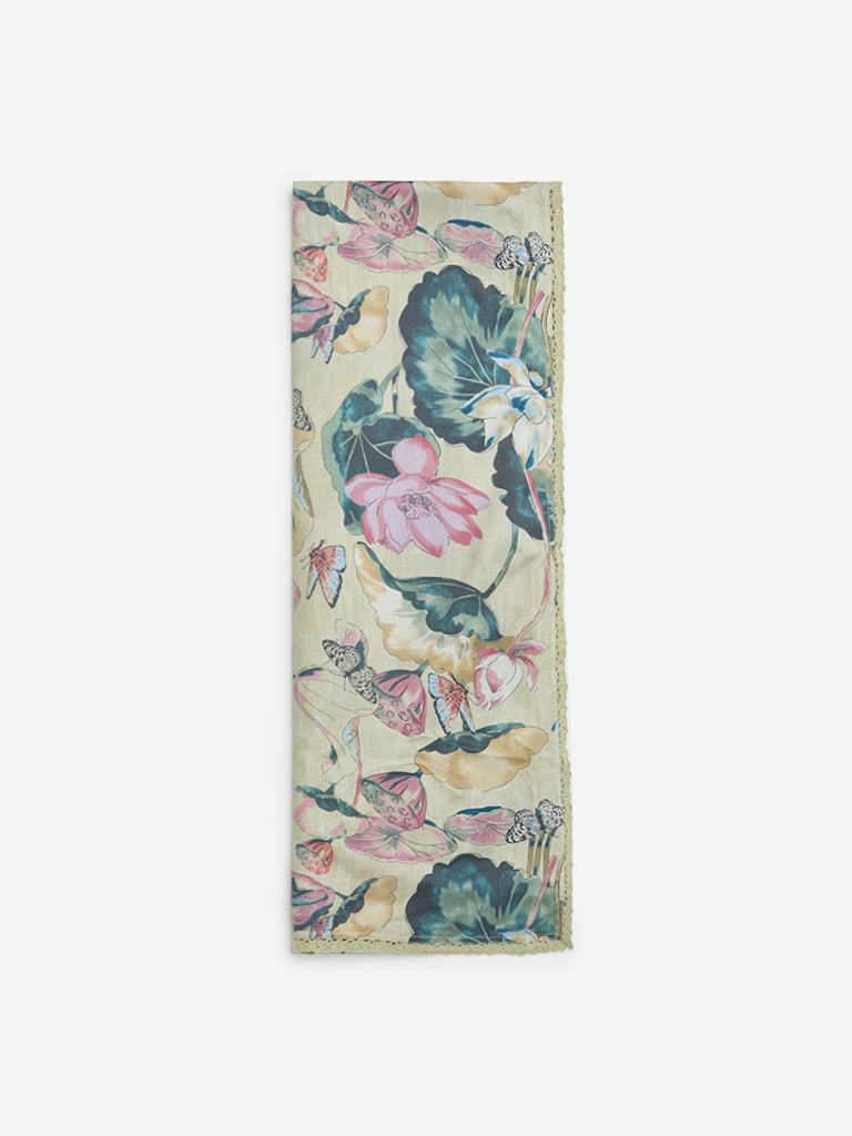Zuba presents this yellow stole featuring botanical patterns throughout. It is crafted from lightweight fabric and finished with a lace trim along the hemline.
